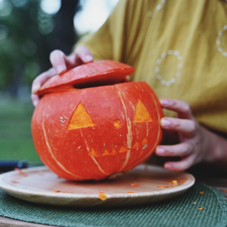 挖一挖香噴噴の南瓜,澄黃色的果肉與尖尖的籽變成有趣的圖案